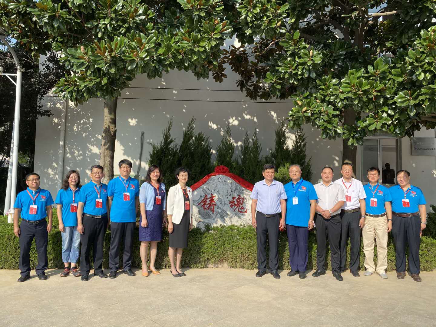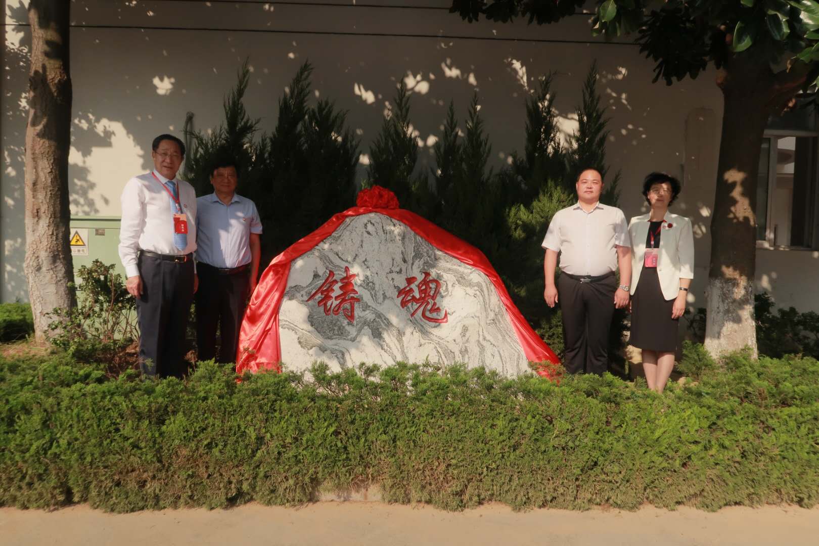 青岛科技大学党委副书记张淑华,党委常委、副校长韦殿华,山东城际轨道交通科技股份有限公司总经理张勇,泗水县委常委、组织部长、青岛科技大学校友秦明共同为“铸魂”校园景观石揭幕。