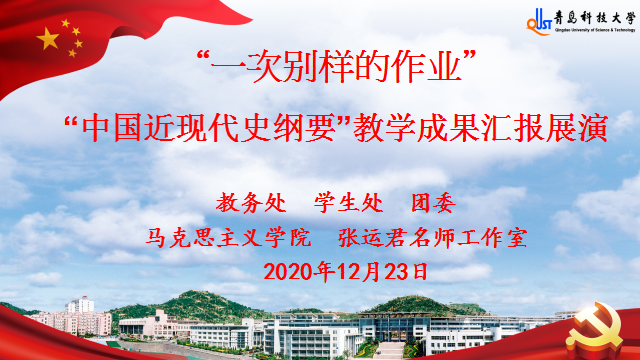 为深入贯彻落实习近平总书记在学校思想政治理论课教师座谈会上的重要讲话精神,着力推进新时代高校思政课改革创新,落实立德树人根本任务,2020年12月23日,由青岛科技大学教务处、学生处、团委、马克思主义学院和山东省高校思政课“张运君名师工作室”联合主办的“一次别样的作业”——“中国近现代史纲要”教学改革成果汇报展演于崂山校区“英科”报告厅顺利举行。青岛科技大学教务处处长王霞、团委书记毛常明、党委宣传部副部长曲明、学生处副处长曹永俊、教务处副处长付鹏程、团委副书记张玉、艺术学院副院长刘名森等嘉宾出席了展演活动,马克思主义学院院长曹胜、副院长曲慧敏、中国近现代史纲要教研室副主任王建美担任展演活动的特邀指导教师。