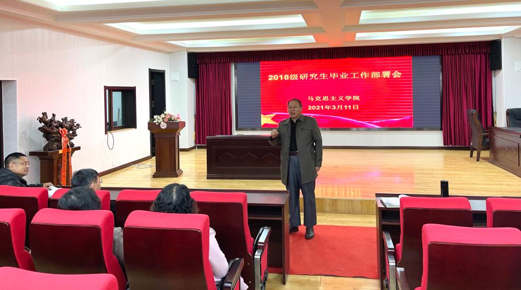 2021年3月11日上午,马克思主义学院2018级研究生毕业工作部署会在学院报告厅召开。马克思主义学院党总支书记张鸣、院长曹胜、副院长张运君,全体2018级研究生及导师参加此次会议。会议由张运君副院长主持。