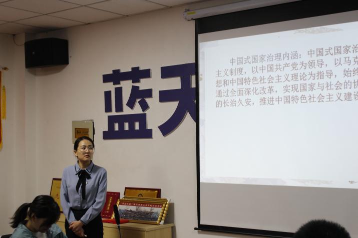 本次宣讲由宣讲团成员韩新怡主持,由徐圣权、孙凌飞、郝彤、张美四位宣讲团成员围绕弘扬志愿精神、明确制度优势、坚定文化自信、重视党史学习四个方面展开宣讲。
