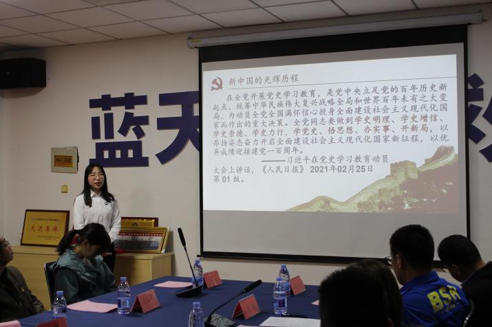 即墨区团委副书记冯健同志讲话,她谈到:“要全面了解中国共产党百年奋斗的光辉历程和历史贡献,不断从党的光辉历史中汲取砥砺奋进的智慧和力量。
