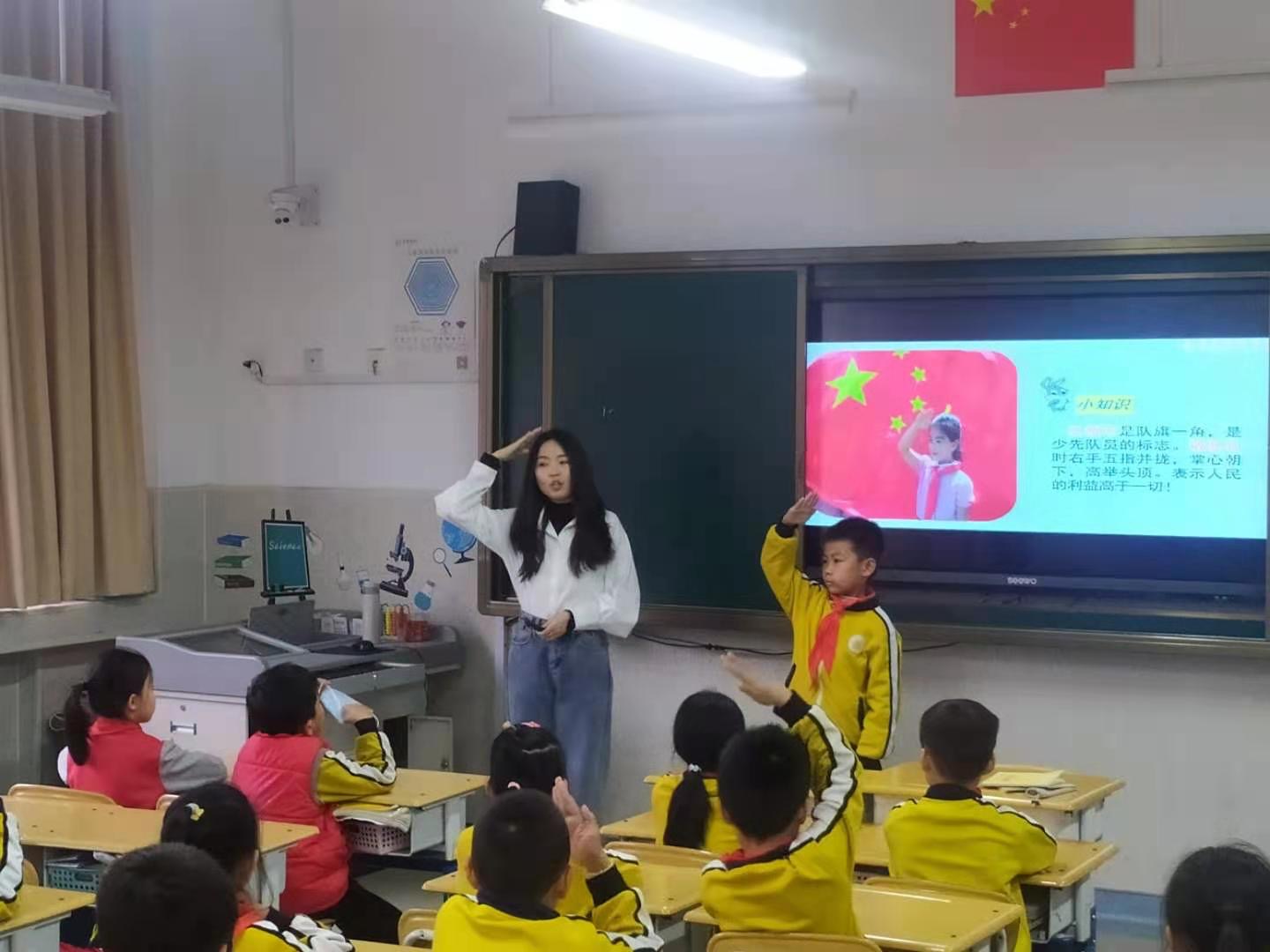 宣讲团成员尚培筠为同学们介绍了共青团团旗、团徽和少先队旗、队徽的由来,指导同学们一起做标准的敬队礼手势,同时也鼓励大家热爱祖国、努力学习、加强身体锻炼,争做共产主义事业的接班人。