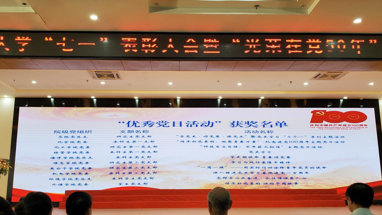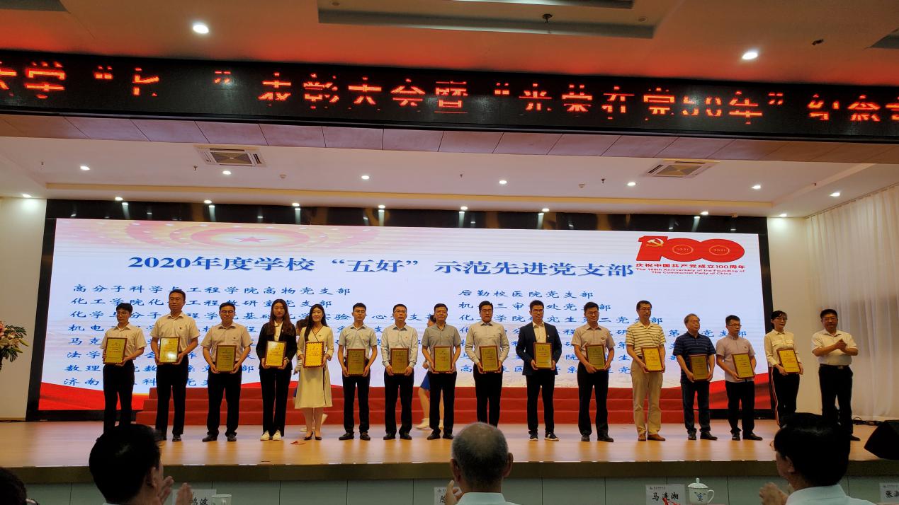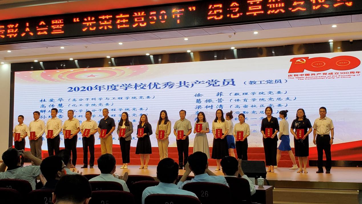 为热烈庆祝中国共产党成立100周年,表彰先进、树立典型,向在党50年老党员致敬,6月29日下午,学校在崂山校区第二报告厅隆重举行“七一”表彰大会暨“光荣在党50年”纪念章颁发仪式。