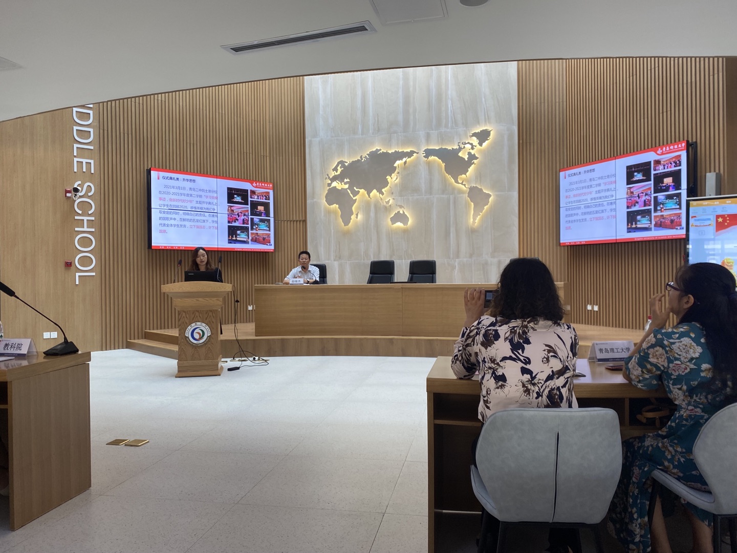 会上,在模拟联合国活动环节,我校学生会、校辩论队成员与青岛二中、青岛二中院士港分校学生共同开展了以“后疫情背景下,亚洲国家疫情突发应急处理机制的转变”为主题的大中小学生同台模拟联合国活动,我校学子从大国的使命担当、中国共产党的领导优势等方面进行发言讨论,仪容仪表、字里行间都充分展示出青科大学子的良好风范。
