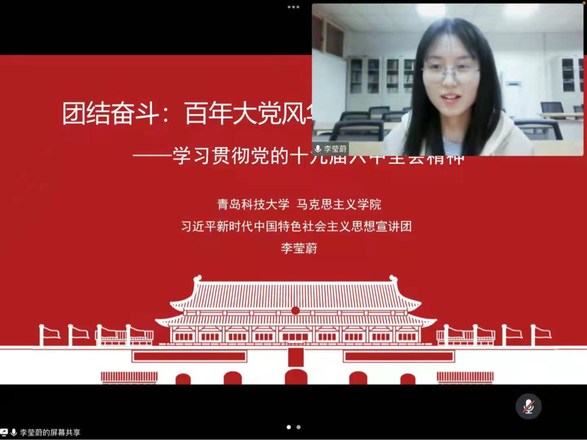 为进一步促进广大青年学生深入了解党史,传承红色基因,坚定理想信念,成为社会主义合格的建设者和接班人。3月27日,青岛科技大学马克思主义学院研究生宣讲团走进传媒学院,采用线上方式开展了题为“学习贯彻党的十九届六中全会精神”的宣讲活动。
