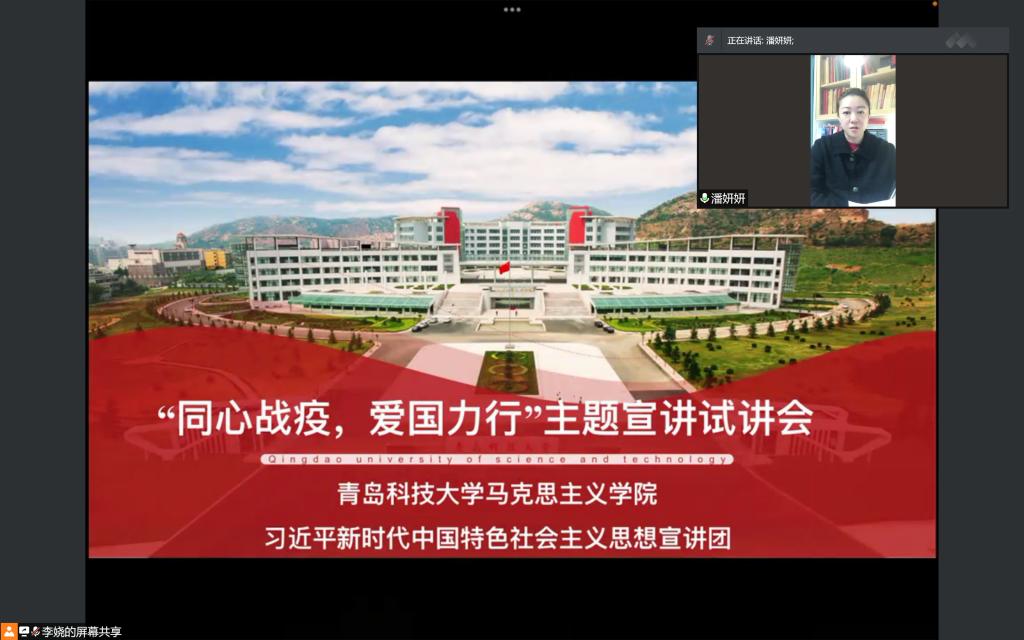 为提升宣讲团成员宣讲能力和水平,进一步引导广大青年学生学习全国人民众志成城抗击疫情的伟大精神,4月17日下午青岛科技大学马克思主义学院习近平新时代中国特色社会主义思想宣讲团采用线上方式开展了“同心战疫,爱国力行”宣讲团试讲活动,本次活动邀请2021级研究生班主任潘妍妍教授进行点评指导。