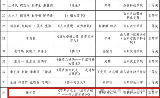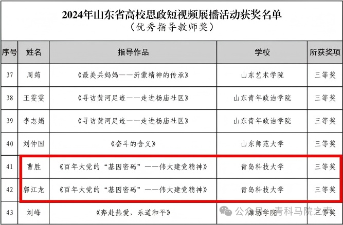 近日,由大众报业集团(大众日报社)、山东省广播电视局共同主办,“大众”新媒体大平台、山东大众报业(集团)发行有限公司联合承办的2024年山东省高校思政短视频展播活动获奖结果公布,马克思主义学院研究生张笑笑作品《百年大党的“基因密码”——伟大建党精神》荣获学生组三等奖,曹胜、郭江龙荣获优秀指导教师。