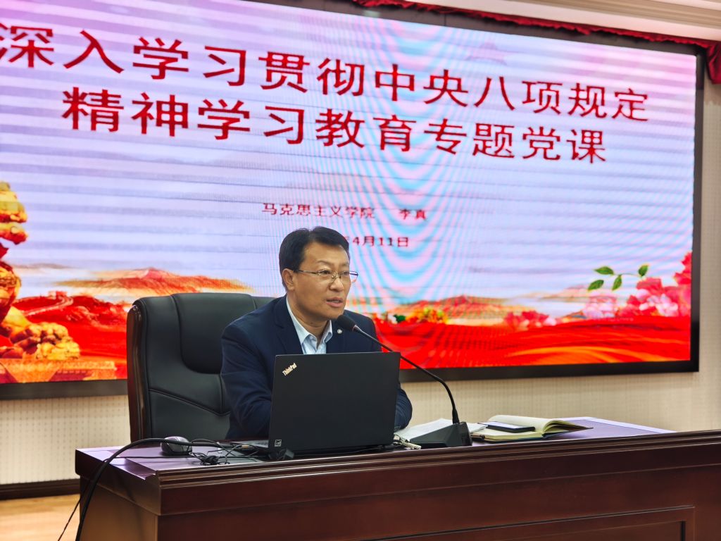 为深入学习贯彻落实中央八项规定精神,推进作风建设常态化长效化,4月11日下午,马克思主义学院党总支书记李真在学院学术报告厅开展深入贯彻中央八项规定精神学习教育专题党课。学院部分教职工和全体研究生参加此次活动。