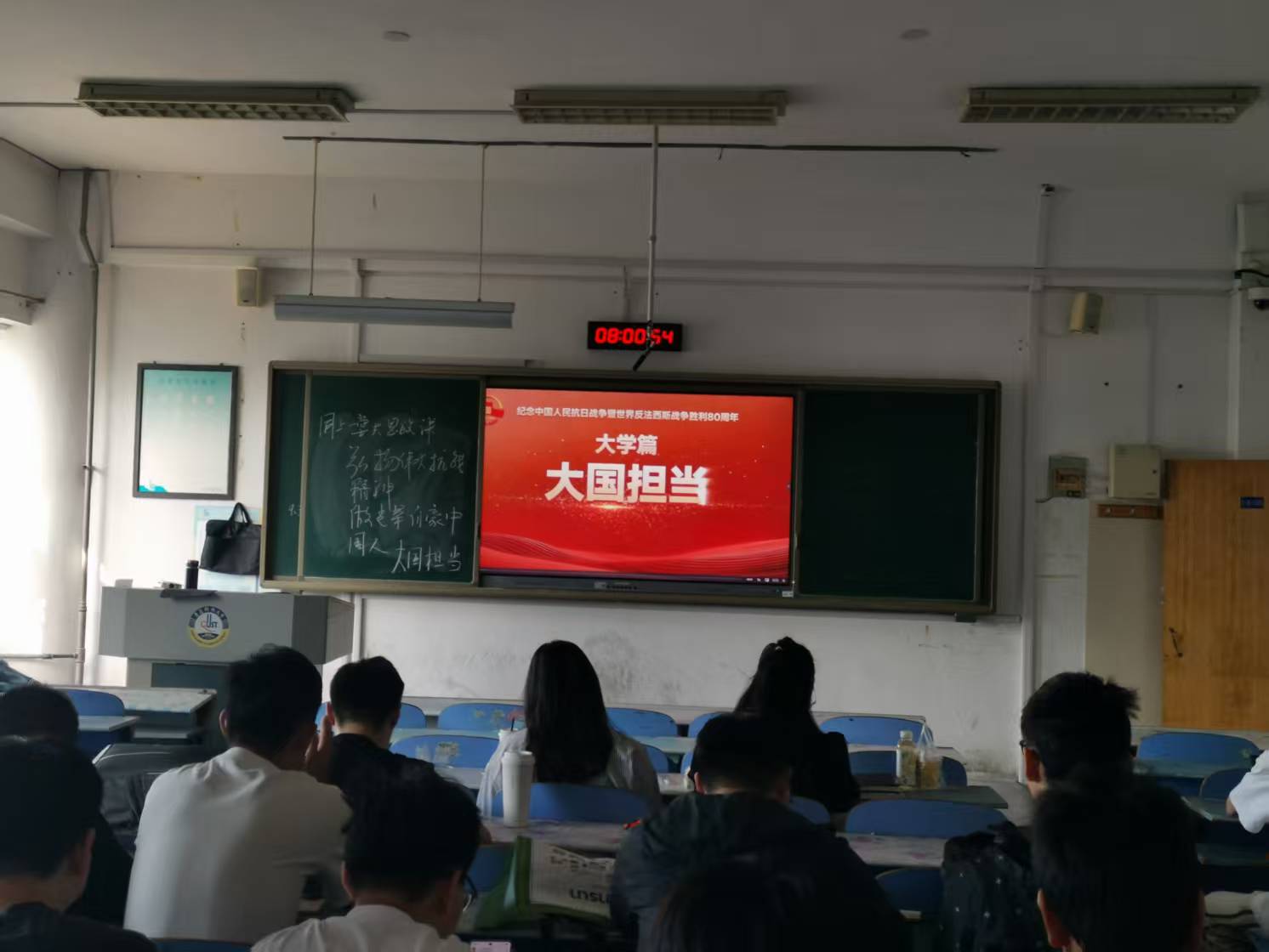 9月18日,为纪念中国人民抗日战争暨世界反法西斯战争胜利80周年,马克思主义学院组织学生共同观看由教育部、中央网信办、人民日报社、国家文物局联合主办的面向全国大中小学生开讲的“弘扬伟大抗战精神,做光荣自豪中国人”思政大课大学篇:大国担当。此次活动通过历史回溯与现实联结,为青年学子呈现了一堂深刻而生动的爱国主义教育课。
