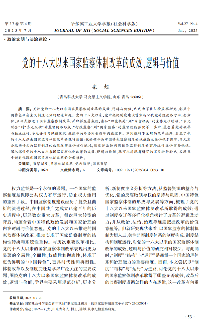 近日,我院栾超老师撰写的学术论文《党的十八大以来国家监察体制改革的成效、逻辑与价值》在CSSCI来源期刊(扩展版)《哈尔滨工业大学学报(社会科学版)》2025年第4期发表。《哈尔滨工业大学学报(社会科学版)》,是由中华人民共和国工业和信息化部主管、哈尔滨工业大学主办的人文社会科学综合性学术刊物,双月刊。目前为南京大学CSSCI来源期刊(扩展版)、RCCSE中国核心学术期刊,全国高校精品社科期刊。