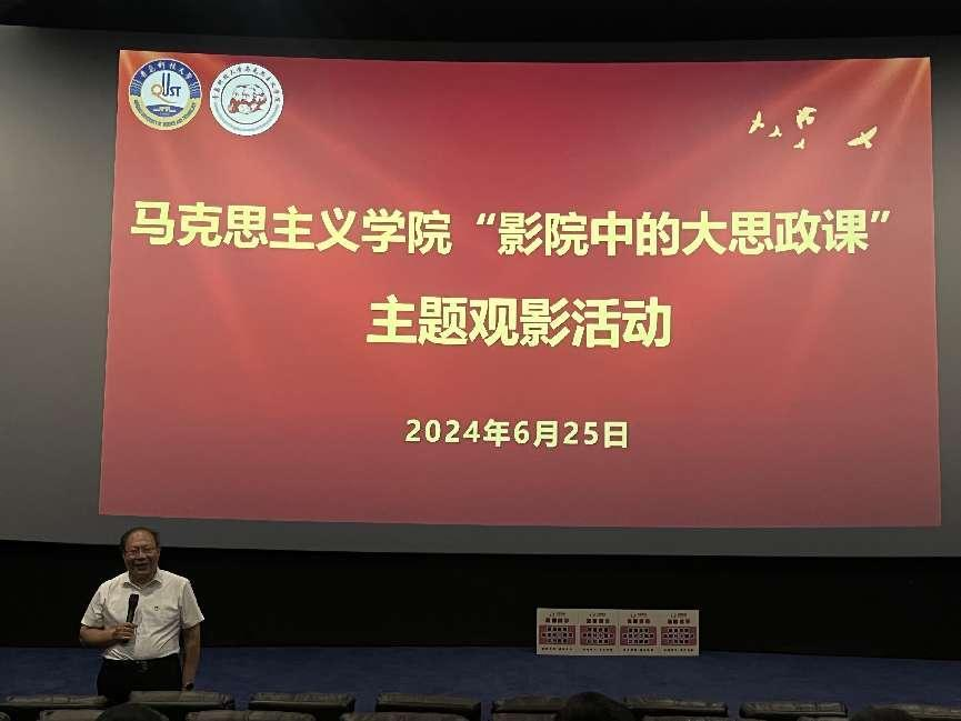 为深入贯彻落实习近平总书记在学校思想政治理论课教师座谈会上的重要讲话精神及对学校思政课建设的重要指示精神,加强师德师风建设,扎实推进思政课改革创新和高质量发展,全面落实立德树人根本任务,6月25日,马克思主义学院组织全体师生齐聚电影院,共同开展了一堂别开生面的“大思政课”。马克思主义学院领导班子及学院全体师生、学校校党委宣传部副部长贾可好等参加此次活动。马克思主义学院院长曹胜主持。