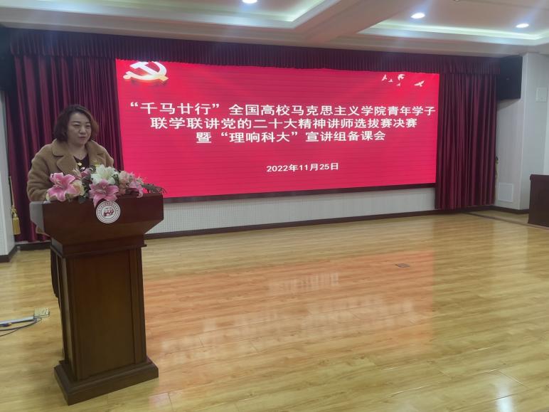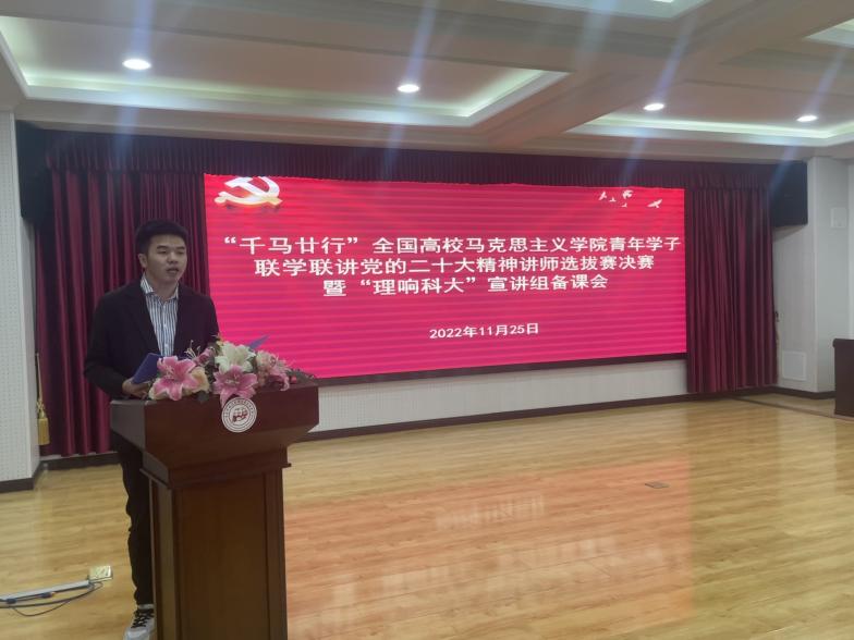为学深悟透落实党的二十大精神,充分发挥马院师生学科理论优势,马克思主义学院于11月25日下午在学术报告厅举办“千马廿行”全国高校马克思主义学院青年学子联学联讲党的二十大精神讲师选拔赛决赛暨“理响科大”宣讲组备课会,形势与政策教研室主任潘妍妍教授、学院团总支书记李莹蔚、研究生会骨干成员担任评委。
