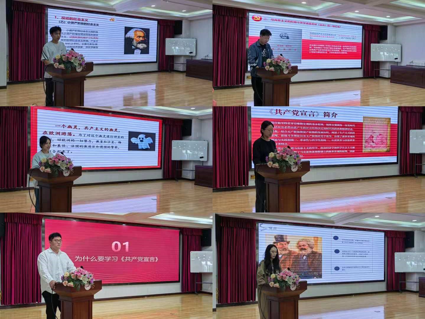 随后,同学们进行经典诵读并分享心得。秦永杰带领大家学习《中华民族共同体概论》,随后,董峻诚、王文琳、王硕、王靖森、朱彦祯六位同学分别从重要意义、主要内容及个人感悟等方面对《共产党宣言》进行分享,详述了反动的社会主义,强调了阶级斗争与革命的必然性,揭示了共产主义“幽灵”隐喻的真相,并与同学们进行了激烈的讨论。他们一致认为,应将理论与时代紧密结合,方能真正领悟经典的深邃内涵。