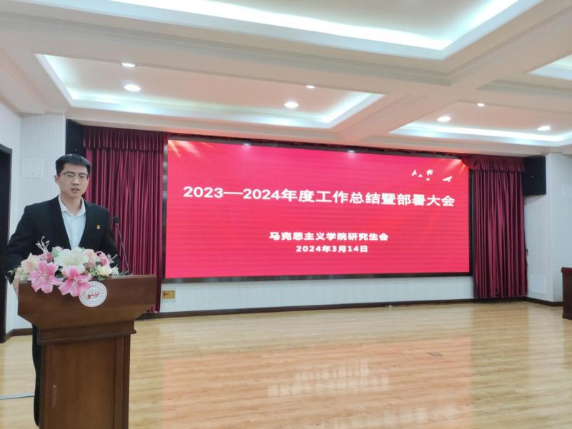 为总结经验展望未来,激励研究生会成员新学期再创佳绩,3月14日晚,马克思主义学院研究生会于学院报告厅举办了2023-2024学年度工作总结部署会。马克思主义学院分团委书记李莹蔚、第十五届研究生会主席杨志国及第十六届研究生会全体成员参加会议。本次会议由2023级研究生杨栋皓主持。