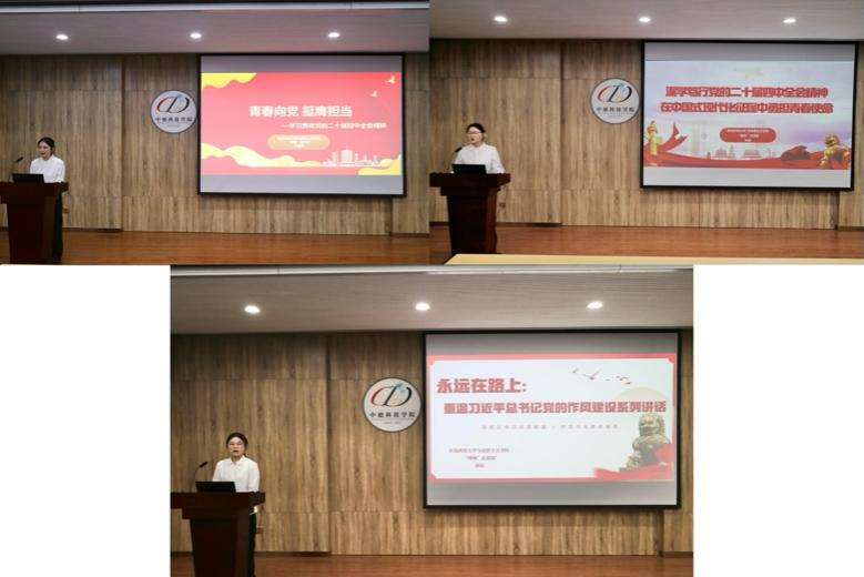 李睿姿以党的二十届四中全会的重大意义为切入口,为大家系统解读了《“十五五”规划建议》所擘画的发展蓝图,并由此引申出新时代青年的责任。张雨重点阐述了党的二十届四中全会的主要成果、总体要求及未来发展目标,并号召青年学生以党的二十届四中全会精神为引领,在新时代征程中勇担使命、砥砺前行。郭钰围绕习近平关于加强党的作风建设的重要论述展开,重点讲解了总书记坚持清正廉洁、以身作则的作风,以及新时代党风廉政建设的核心要求。