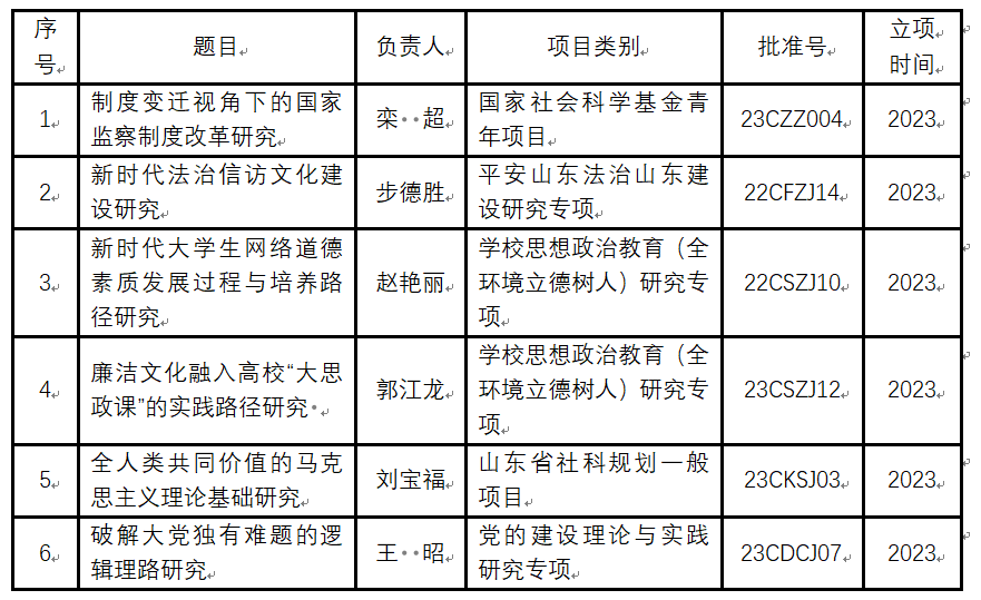 2023年马克思主义学院获批国家社科基金青年项目1项、山东省社科规划一般项目1项、山东省社科规划专项课题4项,其中学校思想政治教育(全环境立德树人)研究专项2项,党的建设理论与实践研究专项1项,平安山东法治山东建设研究专项1项。