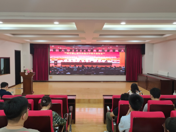 与会人员观看了青岛科技大学2024年教师节庆祝大会主会场的直播。在大会的表彰环节,我院教师曹胜获评2023年山东省高等学校教学名师,郭江龙、马丽娟获得山东省思政课教学比赛特等奖。