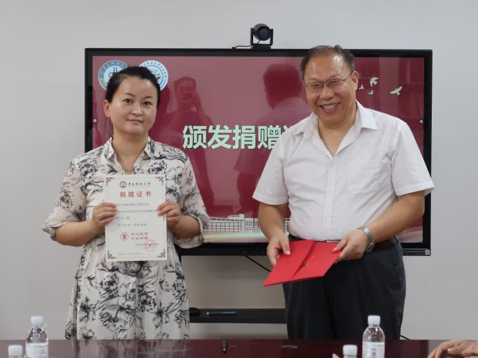青岛科技大学马克思主义学院院长曹胜为姜海芸颁发捐赠证书。