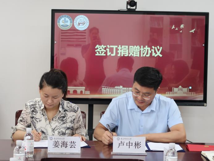 仪式上,青岛泓川化工有限公司总经理姜海芸与青岛科技大学合作发展处副处长兼校友办公室副主任卢中彬签订捐赠协议。