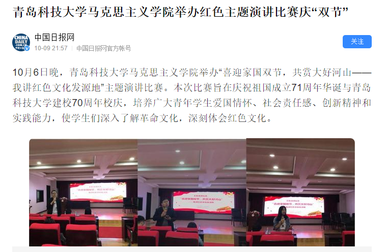 [媒体马院]中国日报网:青岛科技大学马克思主义学院举办红色主题演讲比赛庆“双节”
