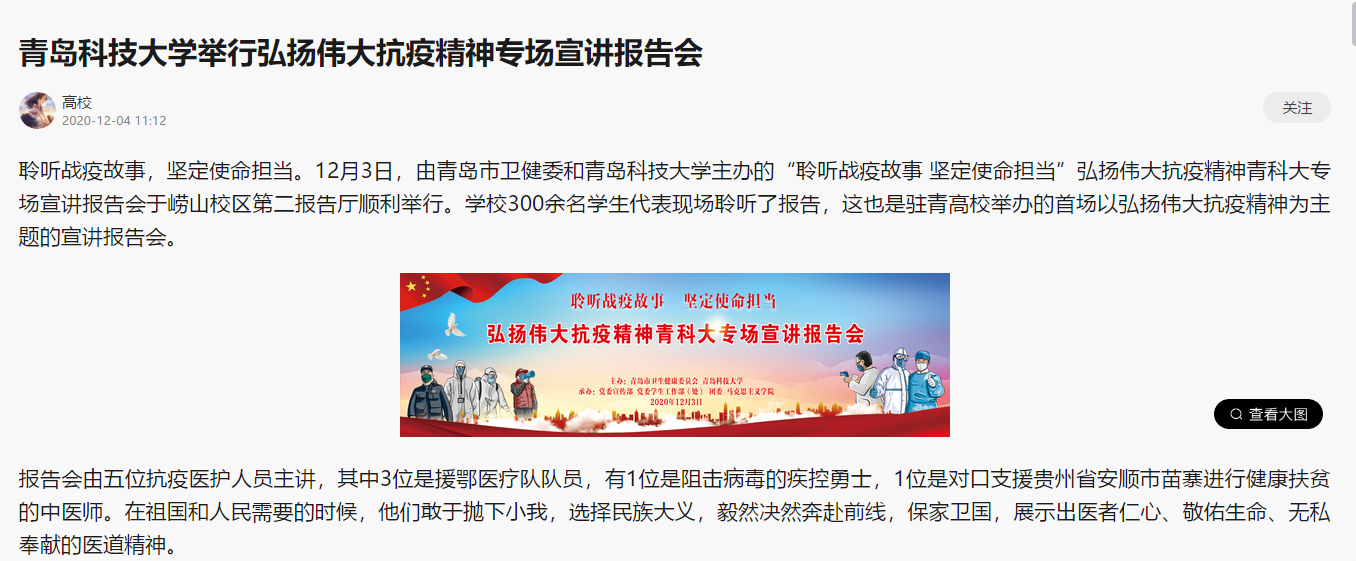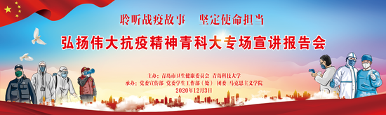 此次抗疫精神宣讲报告会,不仅是一场爱国主义教育活动,更是一次生动深刻的思政大课。青岛科技大学将持续发力,切实深刻领会在重大疫情防控这一特殊背景下高校思想政治教育社会环境、交流空间、育人重点及教育路径发生的重要变化、面临的现实挑战,创新教育载体,开拓教育空间,把好教育规律,提升教育实效,着力发挥好思政课作为落实立德树人根本任务的关键课程作用,大力推动“课程思政”教学改革,用好抗疫故事“鲜活教材”,让伟大抗疫精神入脑入心,引导新时代广大学生成为伟大抗疫精神的阐释者、传承者、践行者。