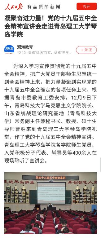 “学习贯彻落实党的十九届五中全会精神,是当前和今后一个时期的重要政治任务,我们会结合曹教授所做报告内容,学深悟透全会精神,指导工作实践,将个人理想,学院建设,国家发展紧密结合,和琴岛学院共同成长。我们会共同努力,谋划好学院的‘十四五’发展规划,计划好自己的发展目标,坚决落实立德树人根本任务,早日把琴岛学院建设成为高水平应用型大学,为国家发展民族复兴做出新贡献。”王乐生说。(青岛日报社/观海新闻记者 杨海涛 通讯员 孟琦)