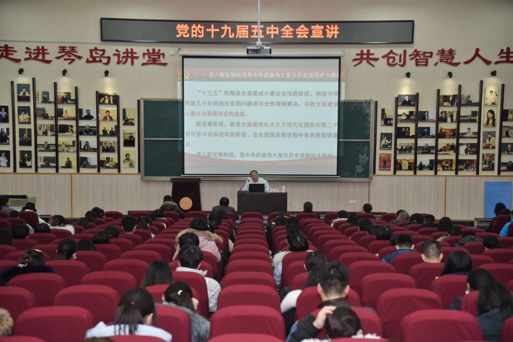 为深入学习宣传贯彻党的十九届五中全会精神,把广大党员干部师生思想统一到全会精神上来,把力量凝聚到实现党的十九届五中全会确定的各项任务上来,根据青岛市委教育工委安排,12月9日下午,青岛科技大学马克思主义学院院长、山东省统战理论研究基地(青岛科技大学)常务副主任兼秘书长、教授、硕士生导师曹胜来到青岛理工大学琴岛学院礼堂,作了党的十九届五中全会精神宣讲。青岛理工大学琴岛学院各学院师生党员、入党积极分子代表、辅导员等400余人在现场聆听了宣讲会。