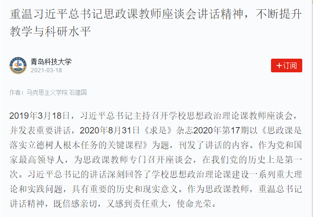 2019年3月18日,习近平总书记主持召开学校思想政治理论课教师座谈会,并发表重要讲话,2020年8月31日《求是》杂志2020年第17期以《思政课是落实立德树人根本任务的关键课程》为题,刊发了讲话的内容。作为党和国家最高领导人,为思政课教师专门召开座谈会,在我们党的历史上是第一次。习近平总书记的讲话深刻回答了学校思想政治理论课建设一系列重大理论和实践问题,具有重要的历史和现实意义。作为思政课教师,重温习近平总书记重要讲话精神,既倍感亲切,又感到责任重大,使命光荣。