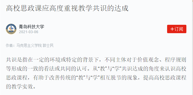 共识是指在一定的环境或特定的背景下,不同主体对于价值观念、程序规则等形成的一致的看法或共同的认可。从“教”与“学”共识达成的角度来认识高校思政课程,有助于改善传统的“教”与“学”相互脱节的现象,提高高校思政课程的教学实效。