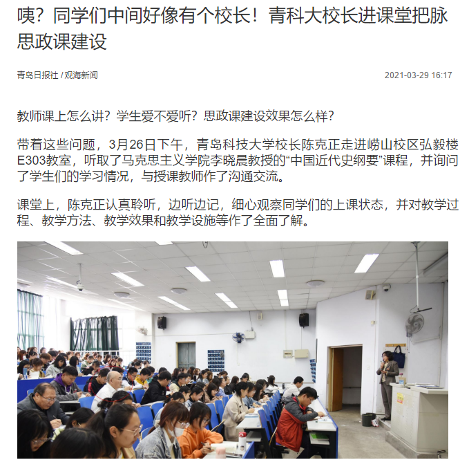 [媒体马院]青岛日报:咦?同学们中间好像有个校长!青科大校长进课堂把脉思政课建设