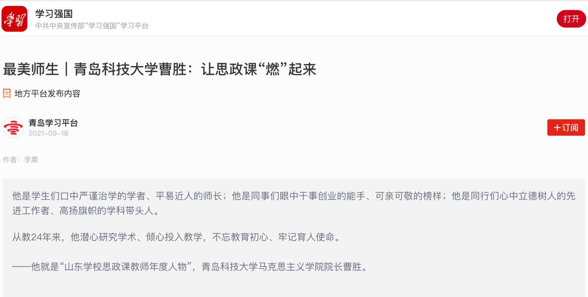 [媒体马院]学习强国:最美师生|青岛科技大学曹胜:让思政课“燃”起来