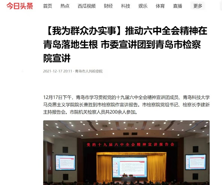 2021年12月17日下午,青岛市学习贯彻党的十九届六中全会精神宣讲团成员、青岛科技大学马克思主义学院院长曹胜受邀赴青岛市检察院作宣讲报告。青岛市检察院党组书记、检察长李建新主持报告会。市院机关检察人员共200余人参加。
