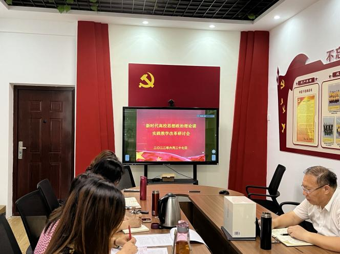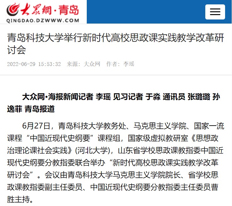 6月27日,青岛科技大学教务处、马克思主义学院、国家一流课程“中国近现代史纲要”课程组,国家级虚拟教研室《思想政治理论课社会实践》(河北大学),山东省学校思政课教指委中国近现代史纲要分教指委联合举办“新时代高校思政课实践教学改革研讨会”。会议由青岛科技大学马克思主义学院院长、省学校思政课教指委副主任委员、中国近现代史纲要分教指委主任委员曹胜主持。