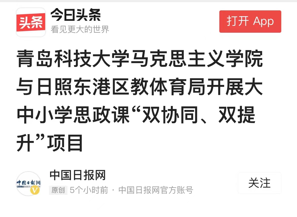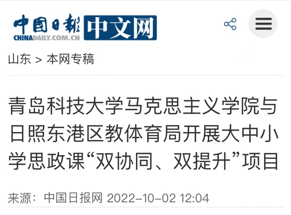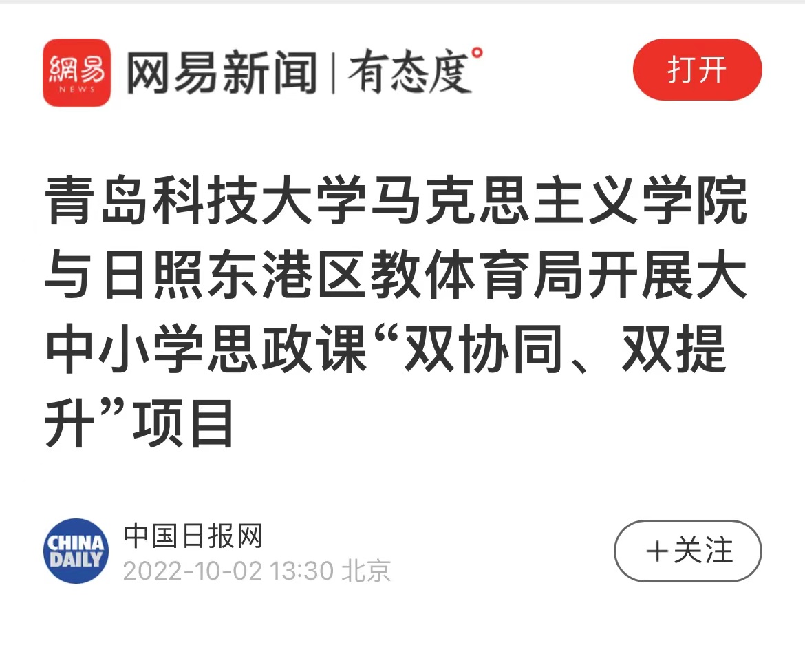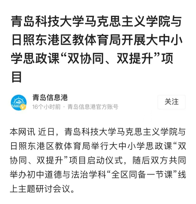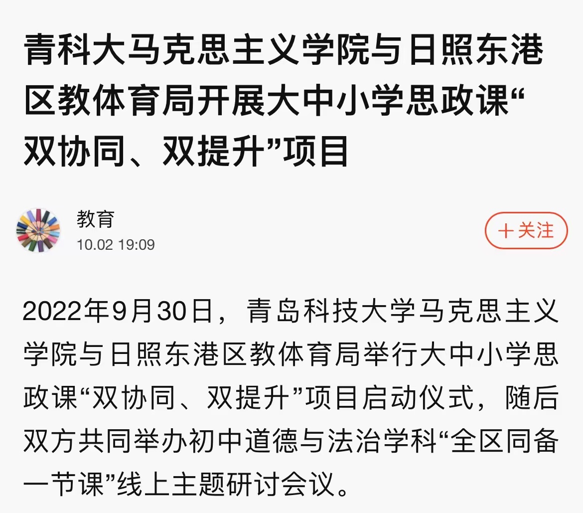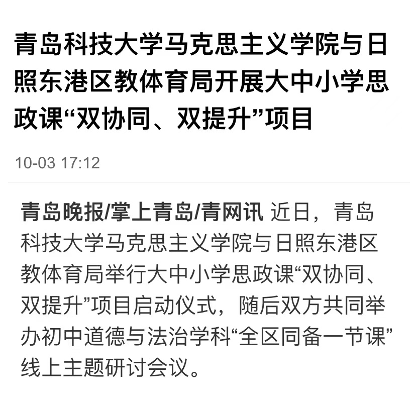 9月30日,青岛科技大学马克思主义学院与日照东港区教体育局大中小学思政课“双协同、双提升”项目正式启动。据悉,双方将在教学、科研、队伍建设等方面的合作将全面展开。