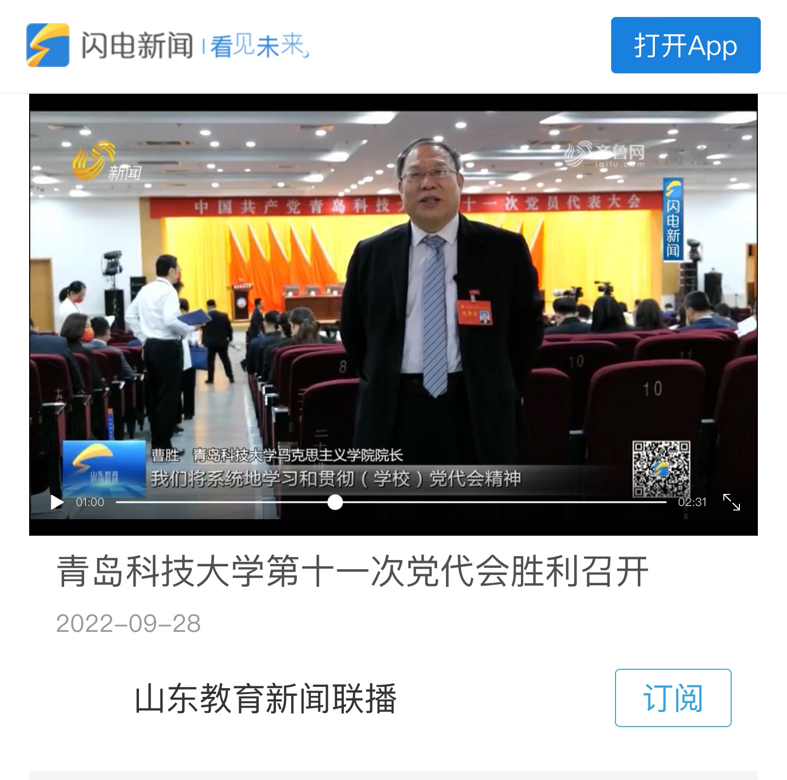 2022年9月24日,青岛科技大学马克思主义学院院长曹胜作为青岛科技大学第十一次党员代表大会代表接受山东广播电视台采访。
