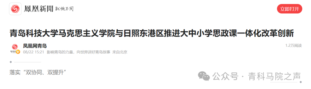 会议强调重点着力于党的二十届三中全会精神融入思政课,扎实推进大中小学思政课一体化的改革创新。双方还探讨了青岛科技大学马克思主义学院与日照市东港区大中小思政一体化深度合作的主要方向。青岛科技大学马克思主义学院充分发挥山东省重点马克思主义学院和省山东省大中小学思政课“双协同、双提升”项目牵头单位作用;日照市东港区教体局充分中小学思政课建设优势、日照市红色文化资源和中国式现代化在日照实践所产生的成就,重点围绕大中学思政课课程建设、教学教研、师资培养和特色创建等方面开展,实现思政课课程目标、课程设置、课程教材内容的有效贯通,努力打造“学生真心喜爱、毕生难忘”省级学校思政课“金课”;着力培养一支优秀师资队伍,实现互聘互兼、共建共享,日照市东港区教体局定期组织中小学教师到青岛科技大学进行短期访学或进修学习,定期以集体备课、名师论坛、现场观摩等形式,使大中小学思政课研讨交流制度化、常态化、实效化;实现教学研究一体化,产出一批优质课程资源,形成一批高水平教学研究成果;充分挖掘青岛市和日照市大思政课资源,依托青岛科技大学马克思主义学院联合青岛市相关单位获批的教育部大思政课实践教学资源,共建大思政课实践教学基地,建立长效机制,建设精品实践教学资源。