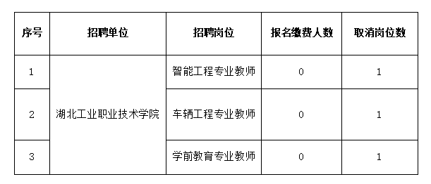 根据2019年湖北工业职业技术学院公开招聘硕士研究生及以上高层次人才报名、初审情况,因部分岗位无符合条件的报名人员,现将岗位取消情况公布如下:
