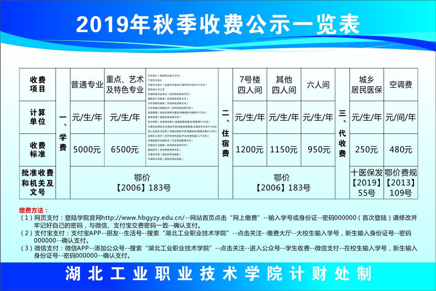 2019年秋季收费公示一览表