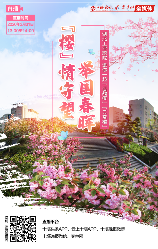 “疫”路同行、“樱”你更美!眼下,湖北工业职业技术学院的樱花似海。往年的春天,广大师生和市民都能在校园近距离赏花。然而,突如其来的重大疫情,打乱了人们的工作生活节奏。在习近平总书记亲自指挥、亲自部署和全国人民共同奋斗下,疫情虽已快速有效遏制,我国战疫取得阶段性重大成果,但全球疫情蔓延,输入风险仍高。根据有关要求,湖工职院仍处于严格封闭状态。为弥补大家不能入校赏花的缺憾,3月31日中午1点至2点,十堰晚报秦楚网通过网络直播,邀请你一起云赏樱,在家欣赏校园美景,感受校园文化。届时,十堰晚报秦楚网全媒体直播团队将出动高清4K直播车,为你带来不一样的赏花体验。你可以通过十堰头条APP、云上十堰APP、十堰晚报微博、十堰晚报微信、秦楚网在在线观看,并可与美女主播一起在线互动。