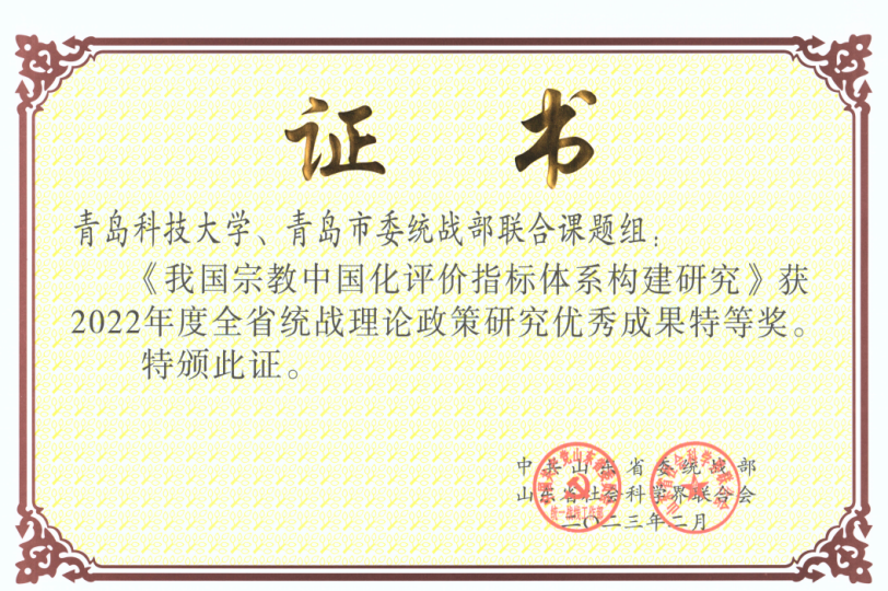 2022年度山东省统战理论政策研究优秀成果特等奖:我国宗教中国化评价指标体系构建研究