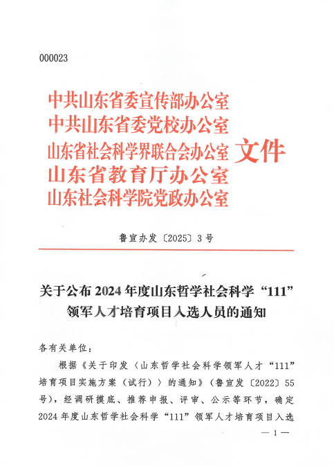 2024年度山东哲学社会科学“111”领军人才培育项目——全省最有引领力的青年学术骨干培育人选:田雨