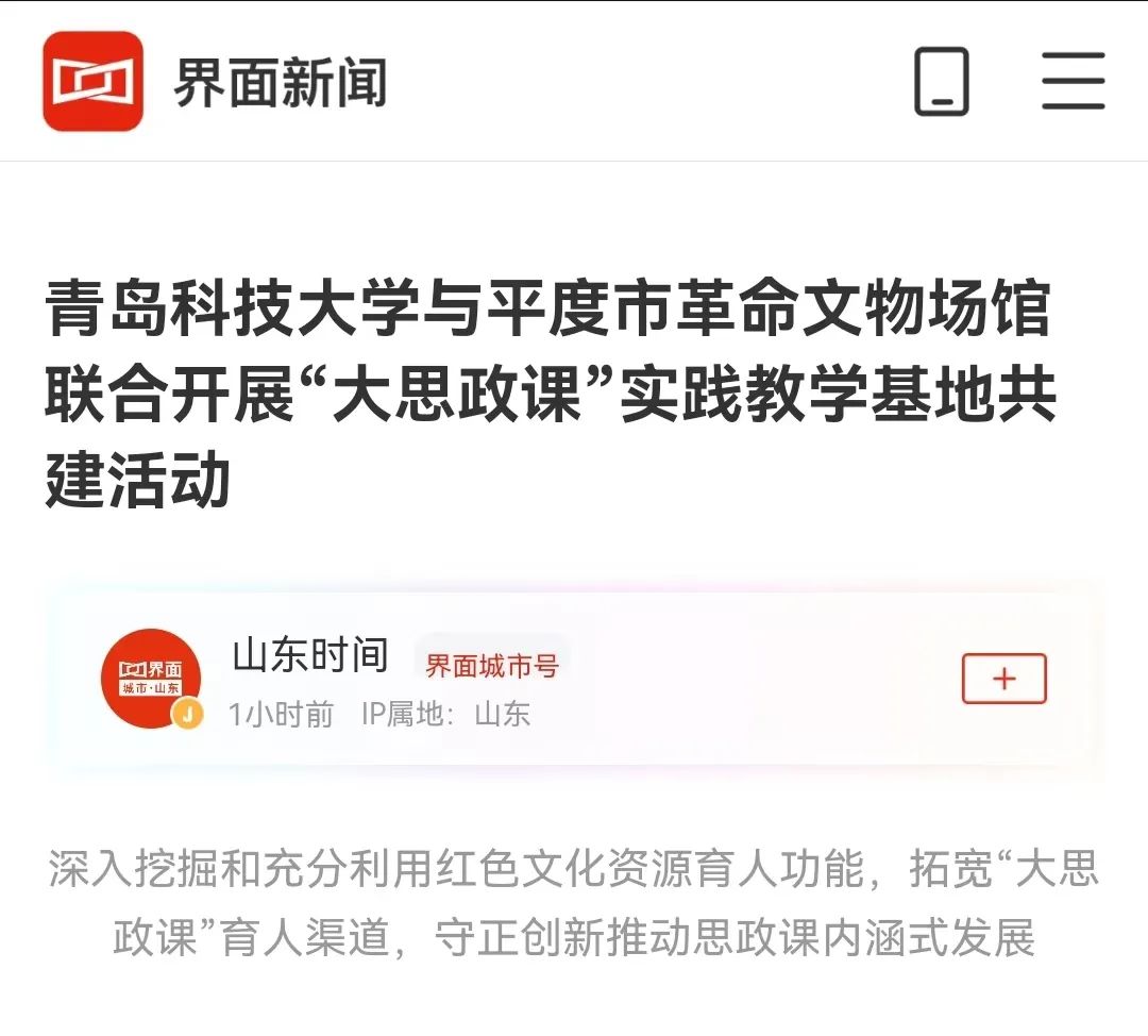 界面新闻:青岛科技大学马克思主义学院与平度市革命文物场馆联合开展“大思政课”实践教学基地共建活动