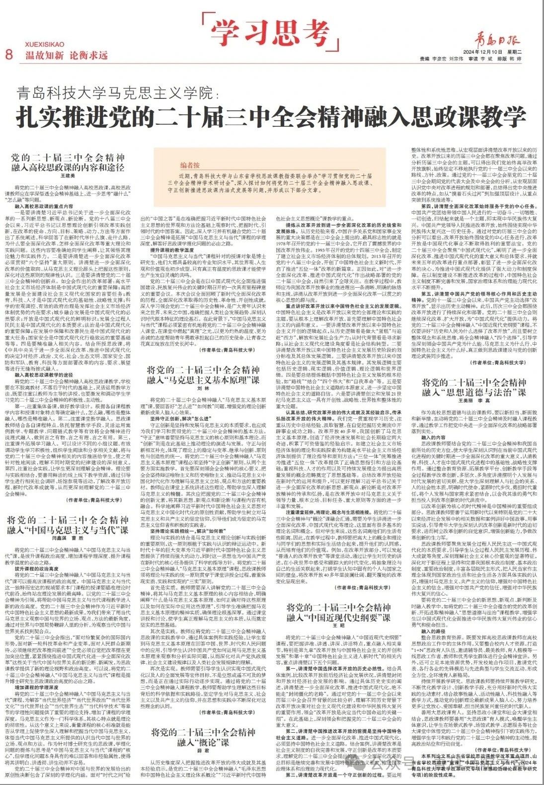 近期,青岛科技大学与山东省学校思政课教指委联合举办“学习贯彻党的二十届三中全会精神学术研讨会”,深入探讨如何将党的二十届三中全会精神融入思政课、守正创新推进思政课内涵式发展等问题,并形成以下部分文章。