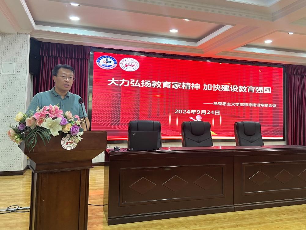 为深入学习贯彻党的二十届三中全会精神和全国教育大会精神,加强思政课教师师德师风建设,大力弘扬教育家精神,紧紧围绕着紧紧围绕立德树人根本任务,加快建设教育强国,9月24日,青科大马克思主义学院于学术报告厅举办“大力弘扬教育家精神 加快建设教育强国”师德师风建设专题会议,学院党总支书记李真,院长曹胜,副院长郭江龙、王建美及全体教师参加了本次会议。会议由李真主持。