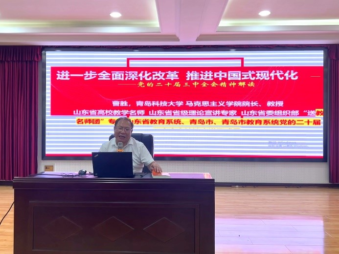 山东省普通高等学校教学名师、山东省省级理论宣讲专家、青岛科技大学院长曹胜教授以“进一步全面深化改革 推进中国式现代化——党的二十届三中全会精神解读”为题作辅导报告,并结合学院实际,带领大家学习了党的二十届三中全会的主题和意义,深刻解读了进一步全面深化改革的指导思想、总目标和原则等内容。