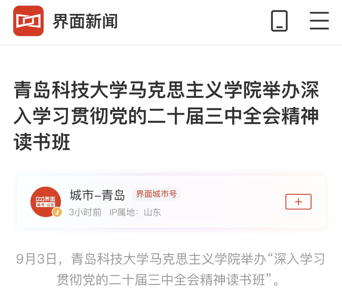 界面新闻:青岛科技大学马克思主义学院举办深入学习贯彻党的二十届三中全会精神读书班