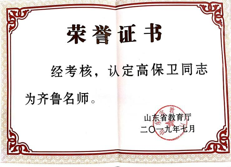 2019年:山东省齐鲁名师证书——高保卫